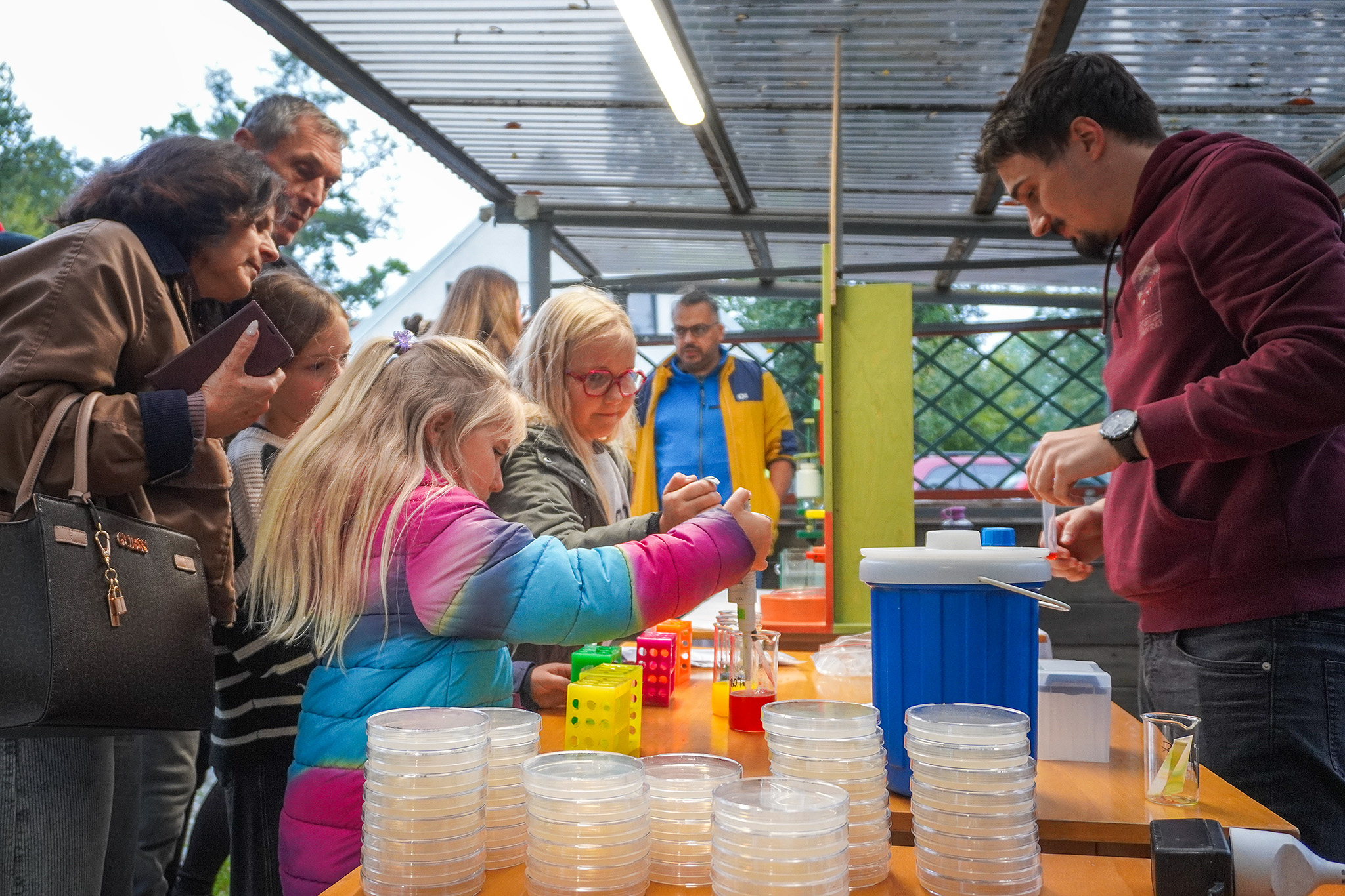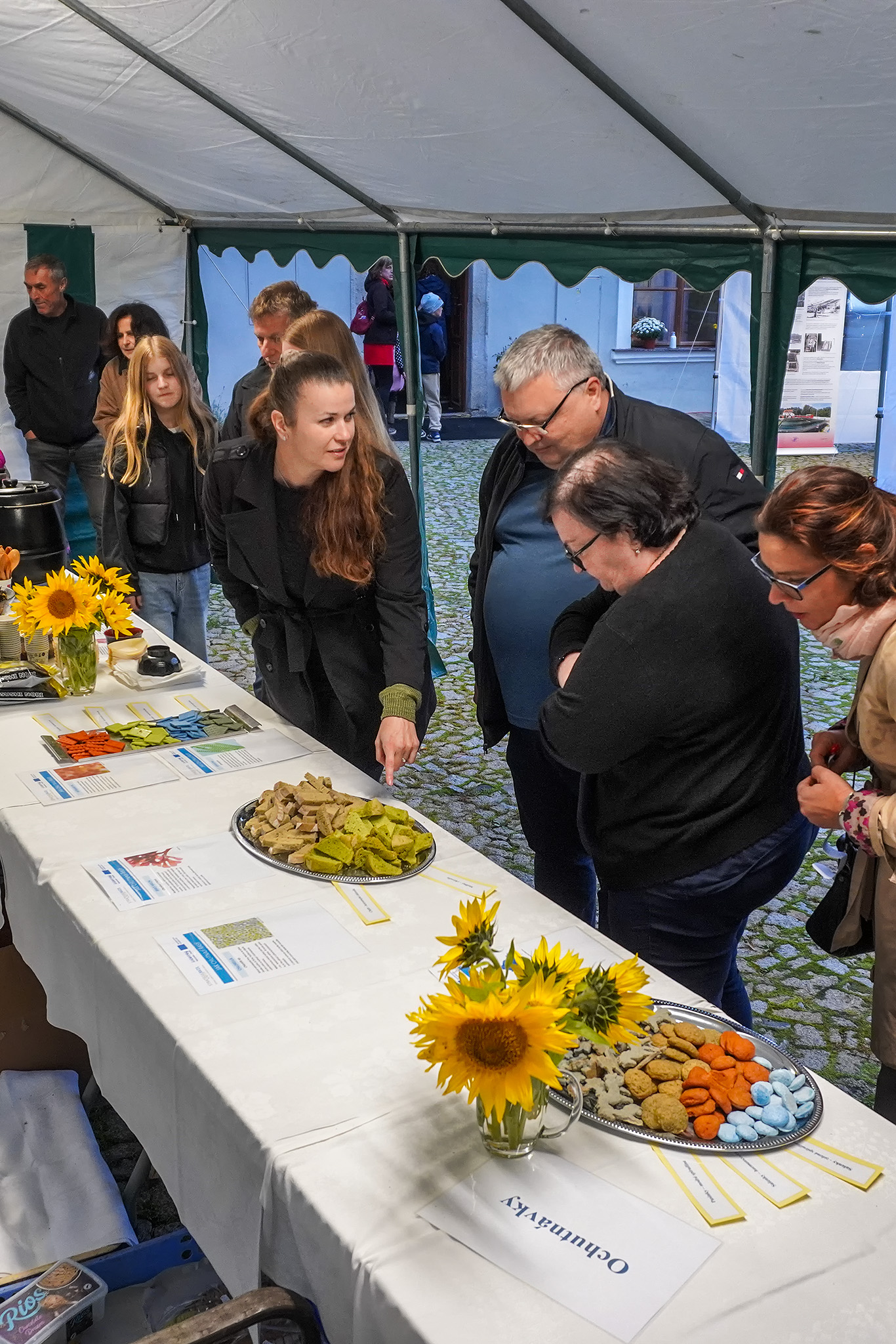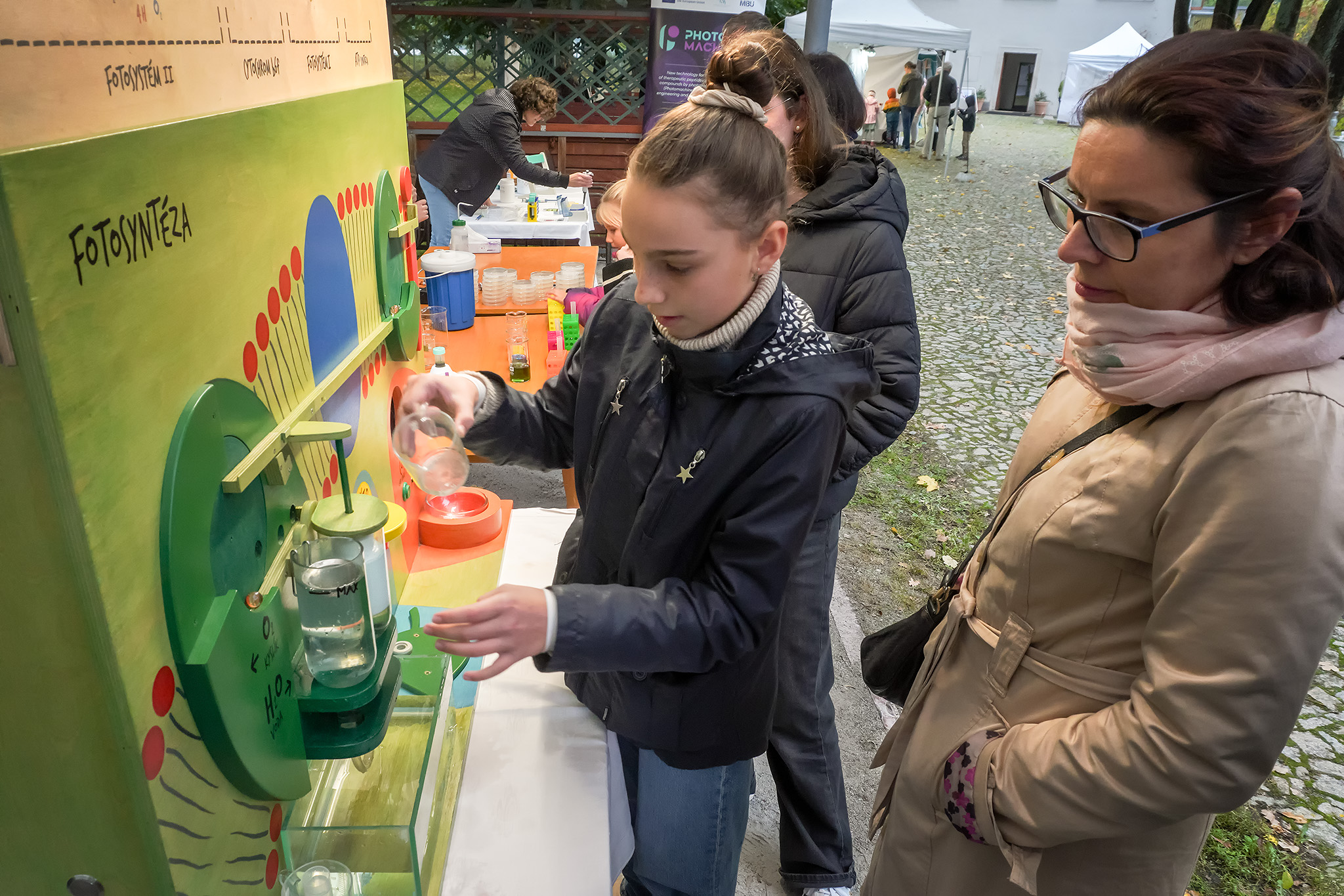 Prezentace před huistorickou budovou barokního mlýna zahrnovala ukázky vědeckých experimentů, model fotosyntézy, kde se návštěvníci prakticky seznámili s procesem v rostlinných buňkách, ale dozvěděli se i o projektech, které propojují výzkum s každodenním životem.