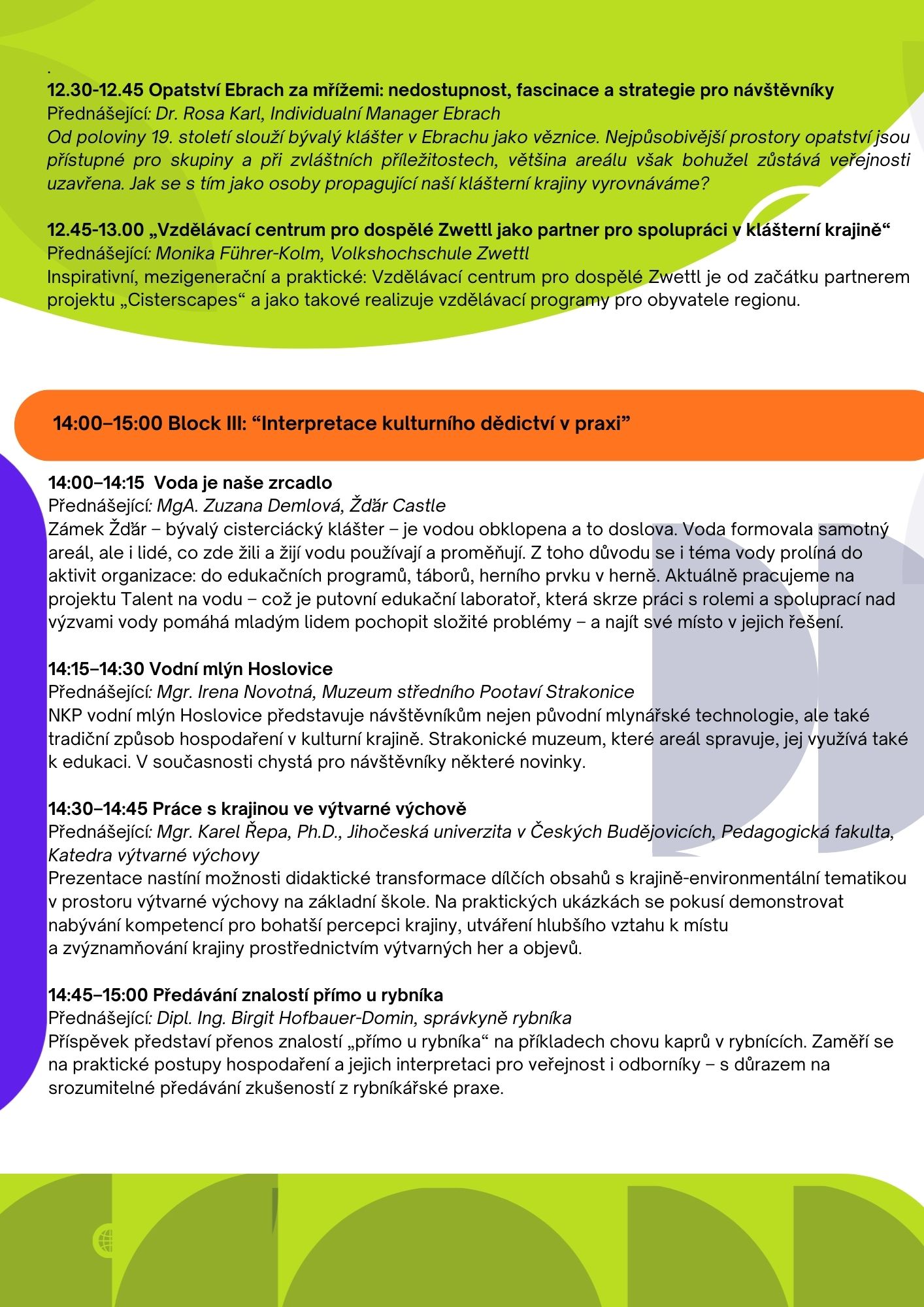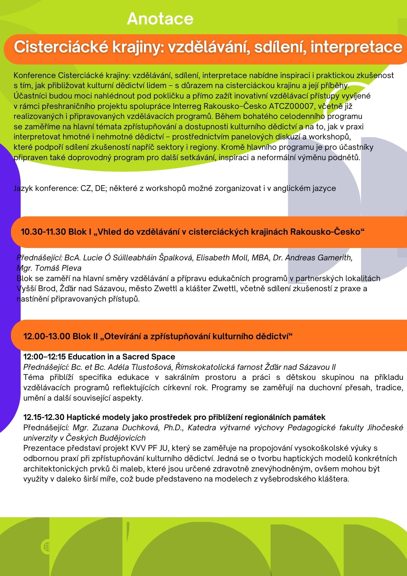 Během bohatého celodenního programu se zaměříme na hlavní témata zpřístupňování a dostupnosti kulturního dědictví a na to, jak v praxi interpretovat hmotné i nehmotné dědictví -prostřednictvím panelových diskuzí a workshopů, které podpoří sdílení zkušeností napříč sektory i regiony.